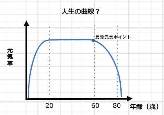 このグラフを見て、60歳代あたり衰退がはじまっていると思うと、グラフにある最終元気ポイントが一番元気が良いというのがわかると思います。さらに言うとここから先はどんどん衰えるということに気がつかされます。