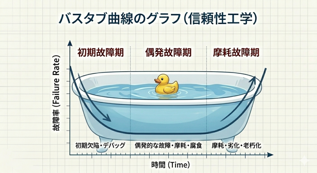 簡単に言うと、機械などの故障は製品作成後の初期段階と年月が経ったところで多くなるというもので、製品の寿命特性曲線とも言われてます。